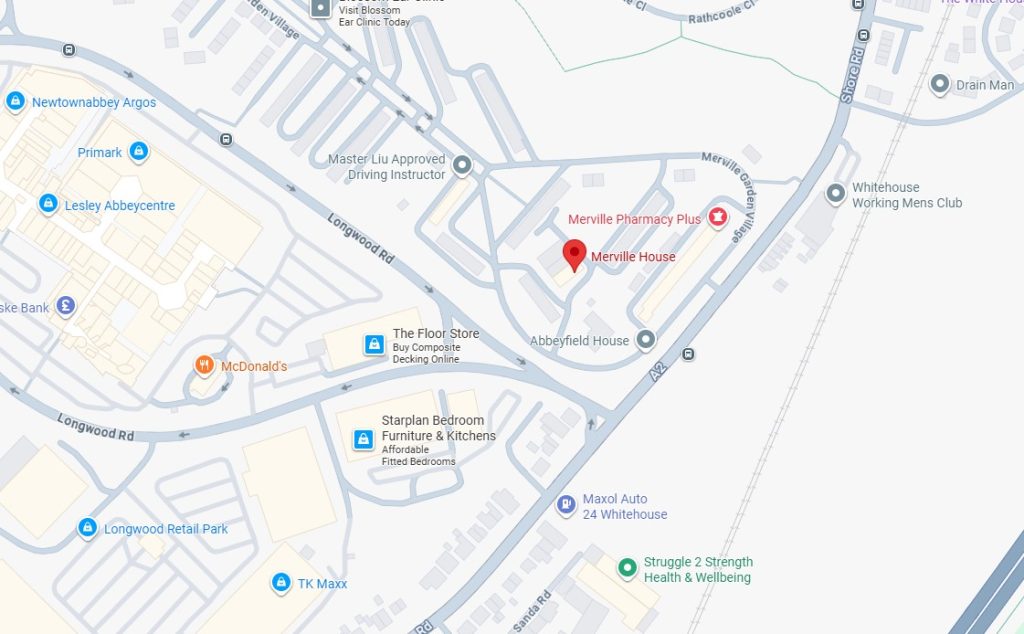 Merville House, Merville Garden Village, Newtownabbey BT37 9TH. The entrance to Merville Garden Village is from the Shore Road, just after the left turn to the Abbey Centre.